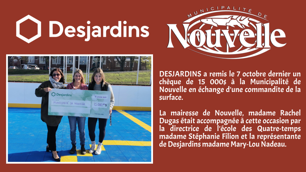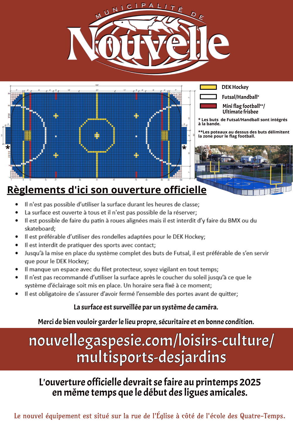 La plateforme Multisports Desjardins est le fruit d’une collaboration entre la municipalité de Nouvelle, le Centre de services scolaire René-Lévesque, l’Association sportive de Nouvelle, Services Secours Baie-des-Chaleurs et la caisse Desjardins Baie-des-Chaleurs. Un bac « prêt pour bouger » vous donnent accès à du matériel sportif gratuit grâce à Circonflexe.